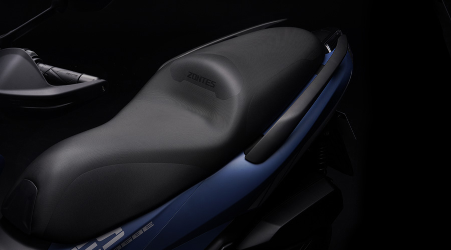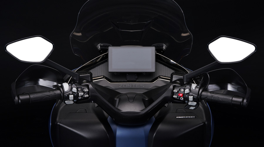 El Maxiscooter Zontes llega completamente equipado: mandos retroiluminados, app para gestión remota del vehículo, caballete central y lateral, freno de estacionamiento, manetas regulables, parrilla portaobjetos y mucho más.